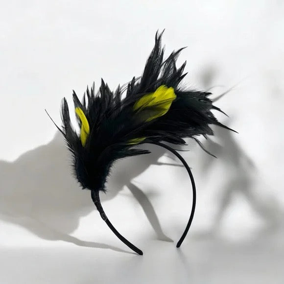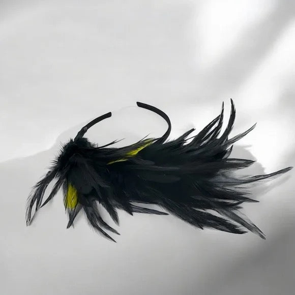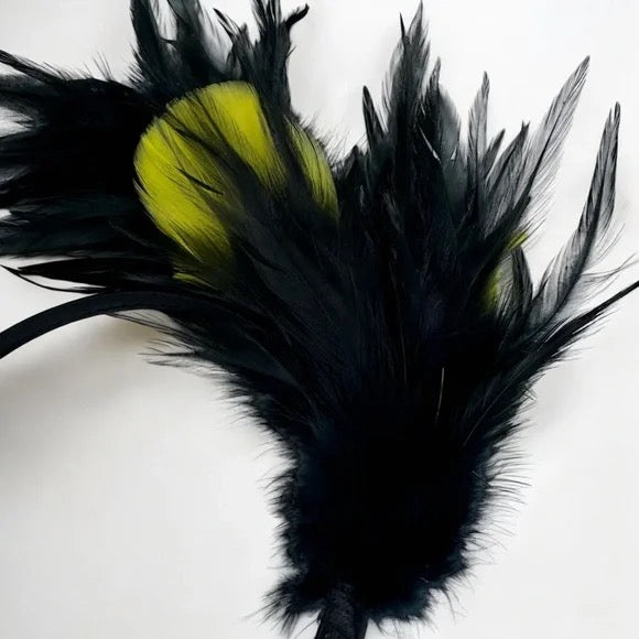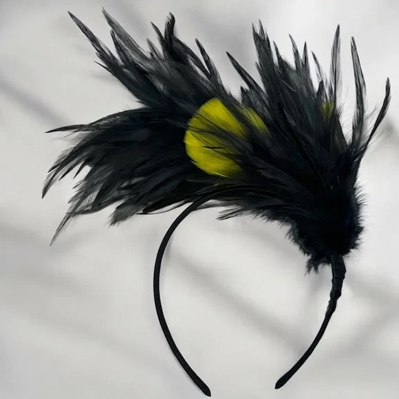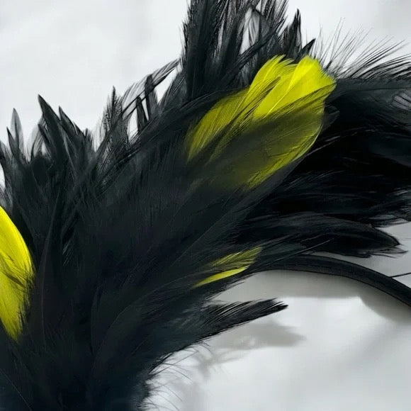 Elevate your costume or outfit with this fabulous yellow and black feathered headband! Brand new and crafted with excellent quality, this headpiece is designed for comfort and style. With its nonslip grip, you can wear it all day without worry.