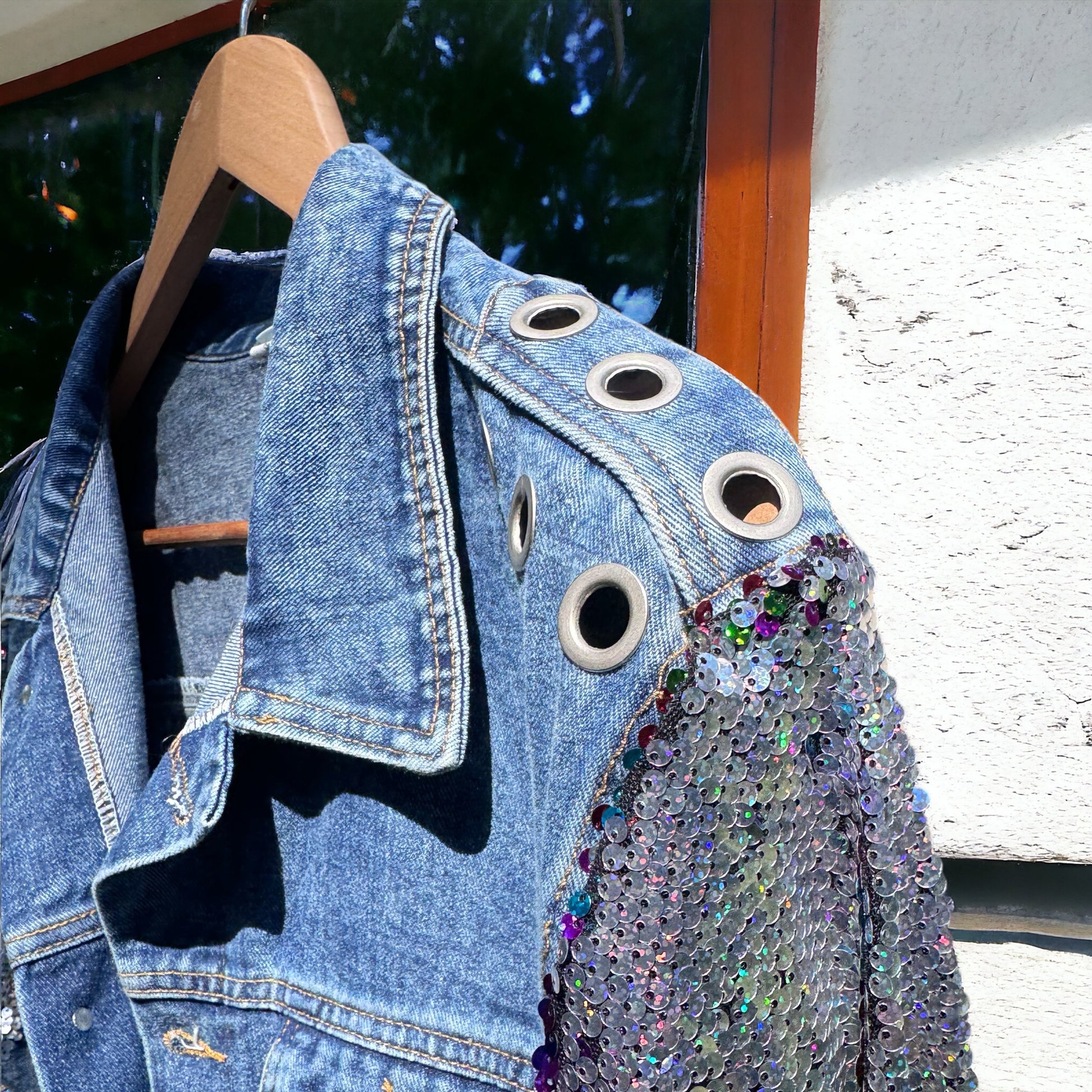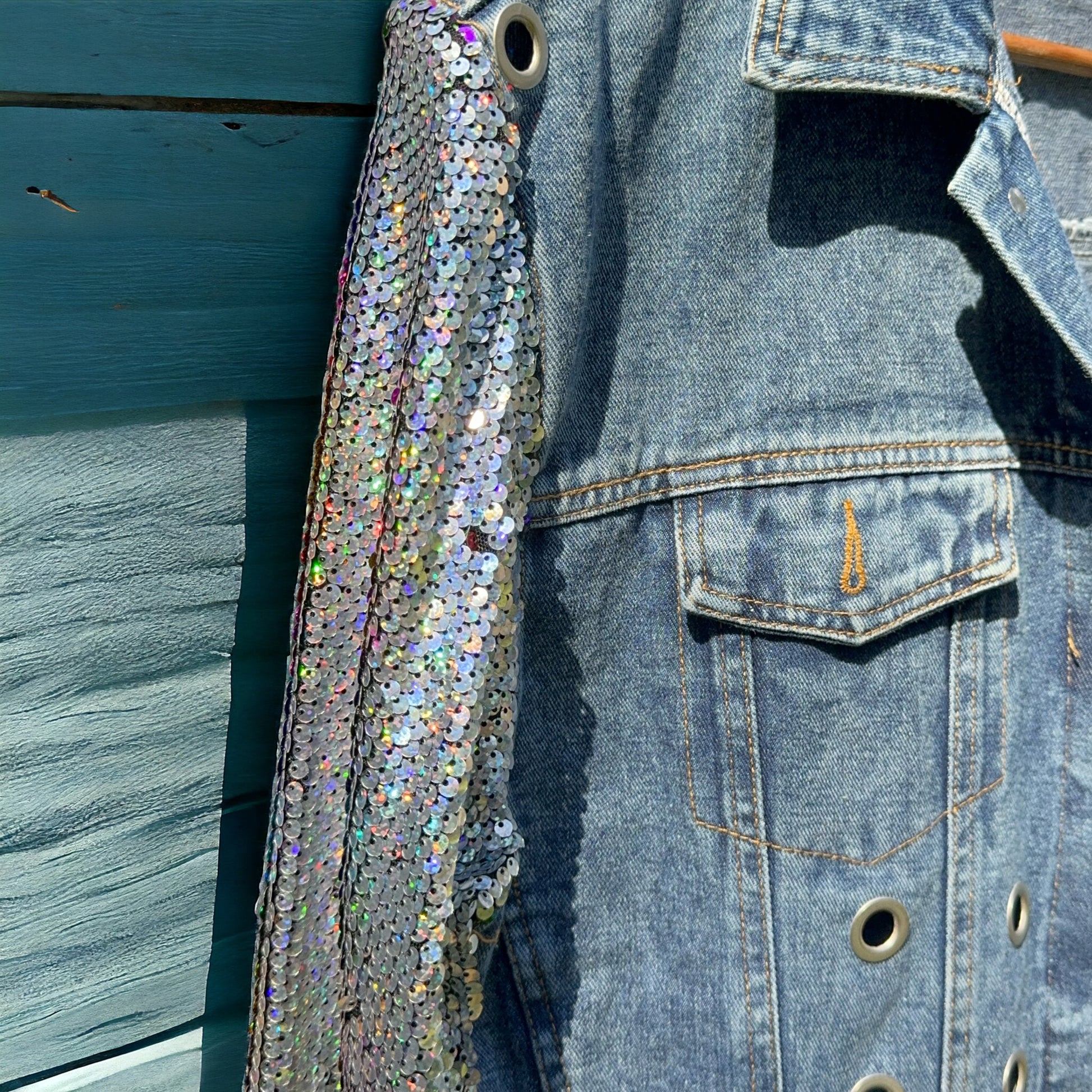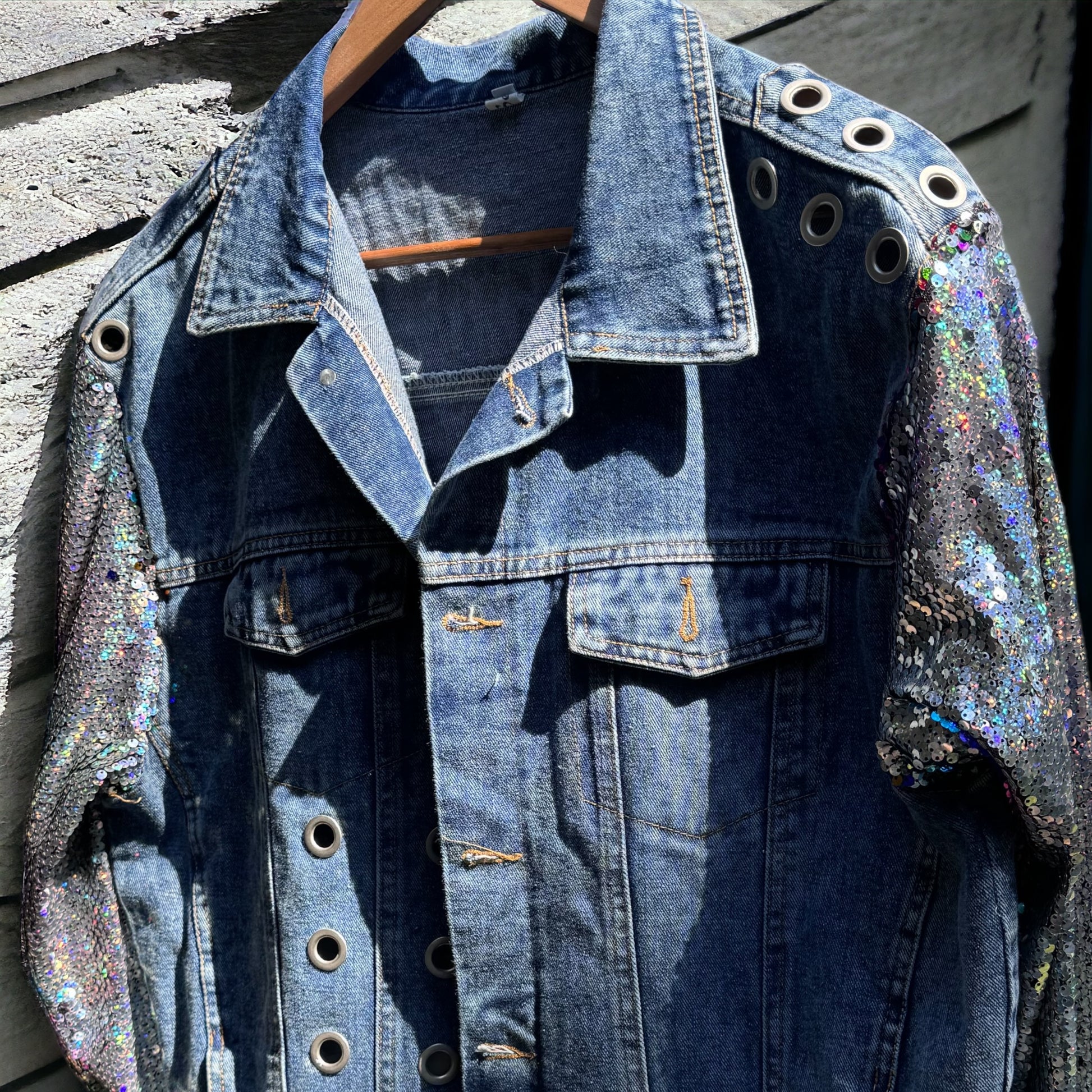 Upcycled Jean Jacket with Sparkly Sequin Sleeves