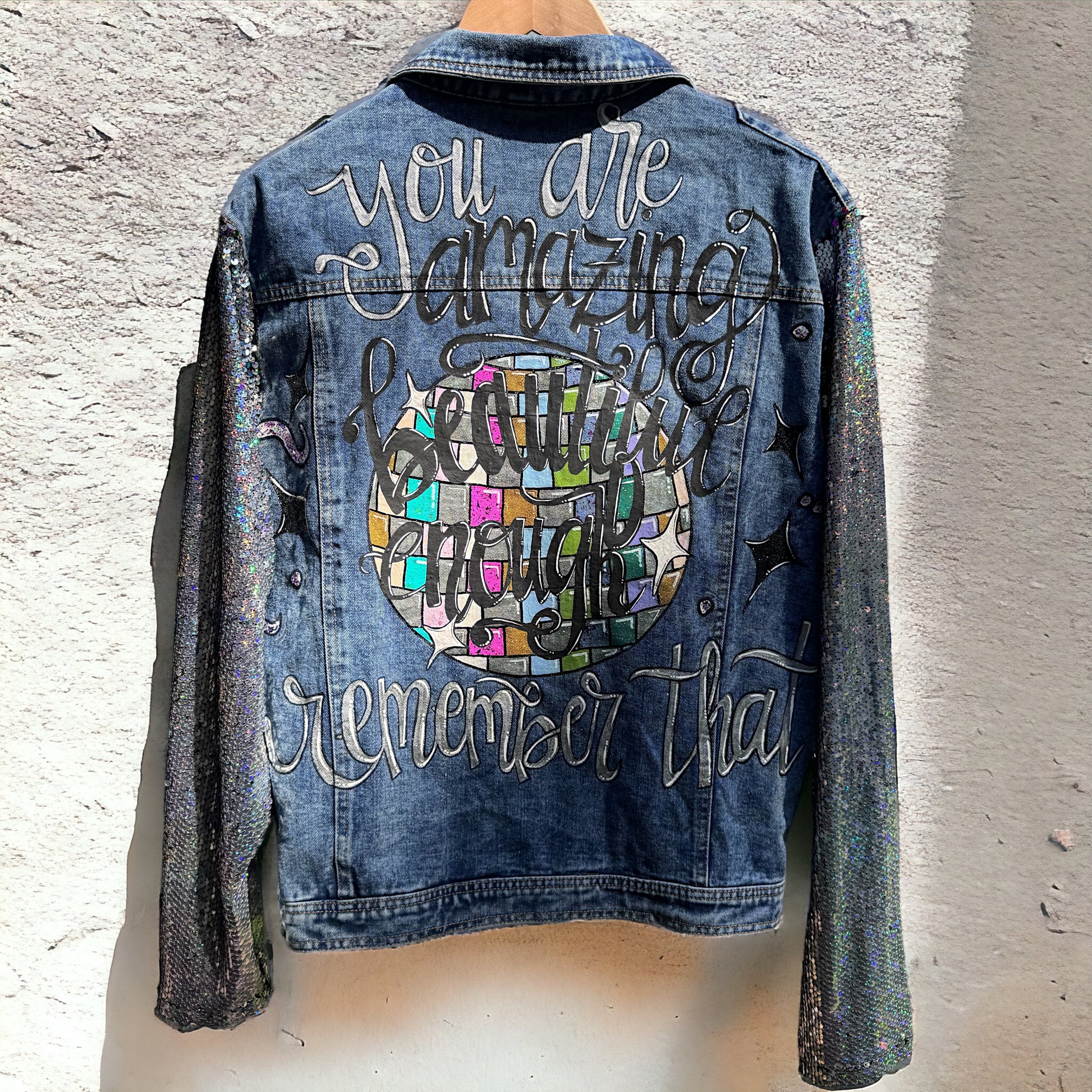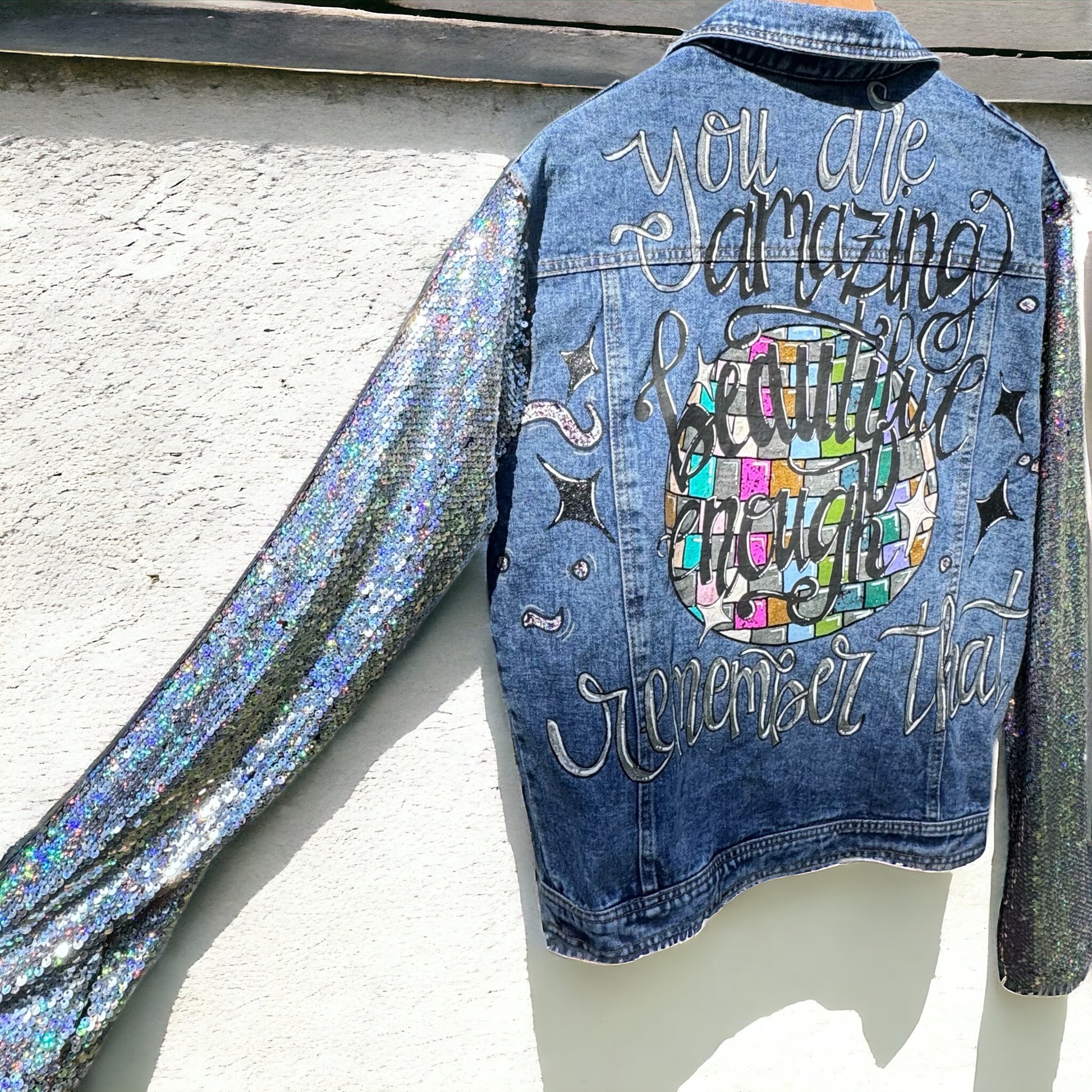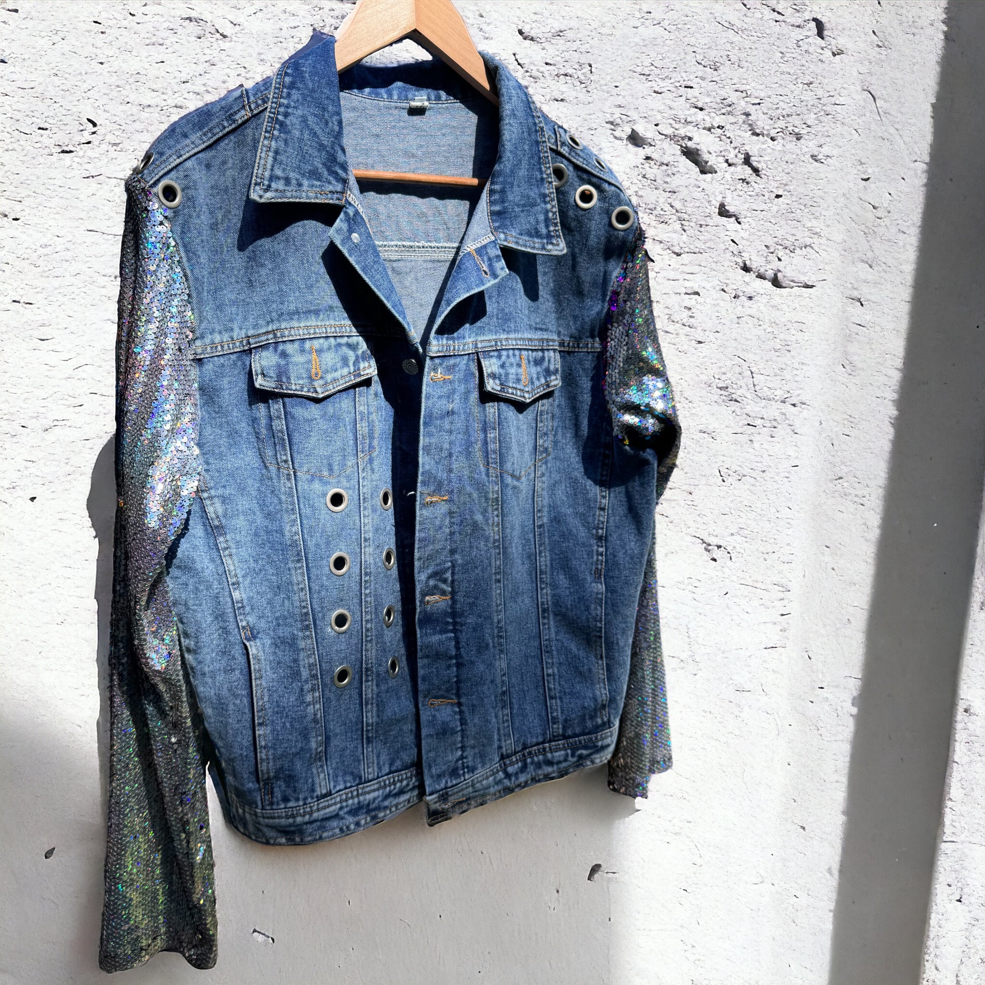 Keywords: Upcycled Jacket, Jean Jacket, Oversized Denim, Sequin Sleeves, Hand Painted, Unique Fashion, Eras Tour Outfit, Statement Piece