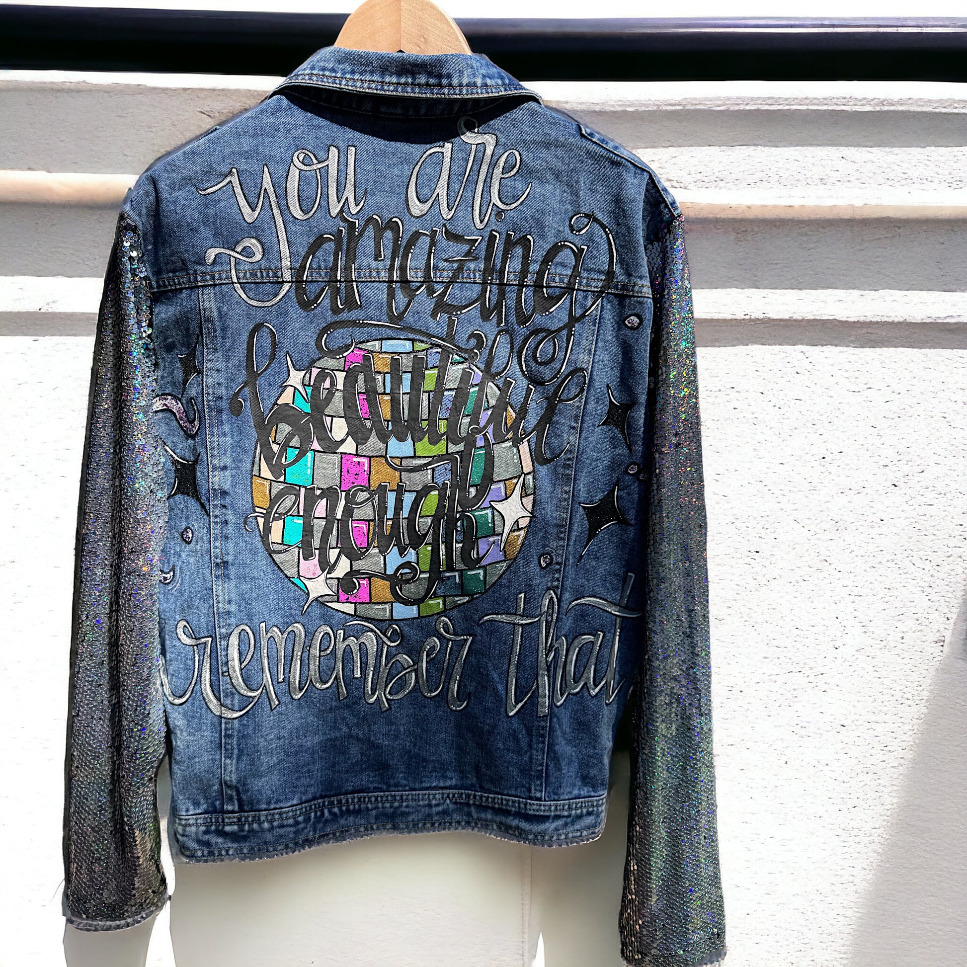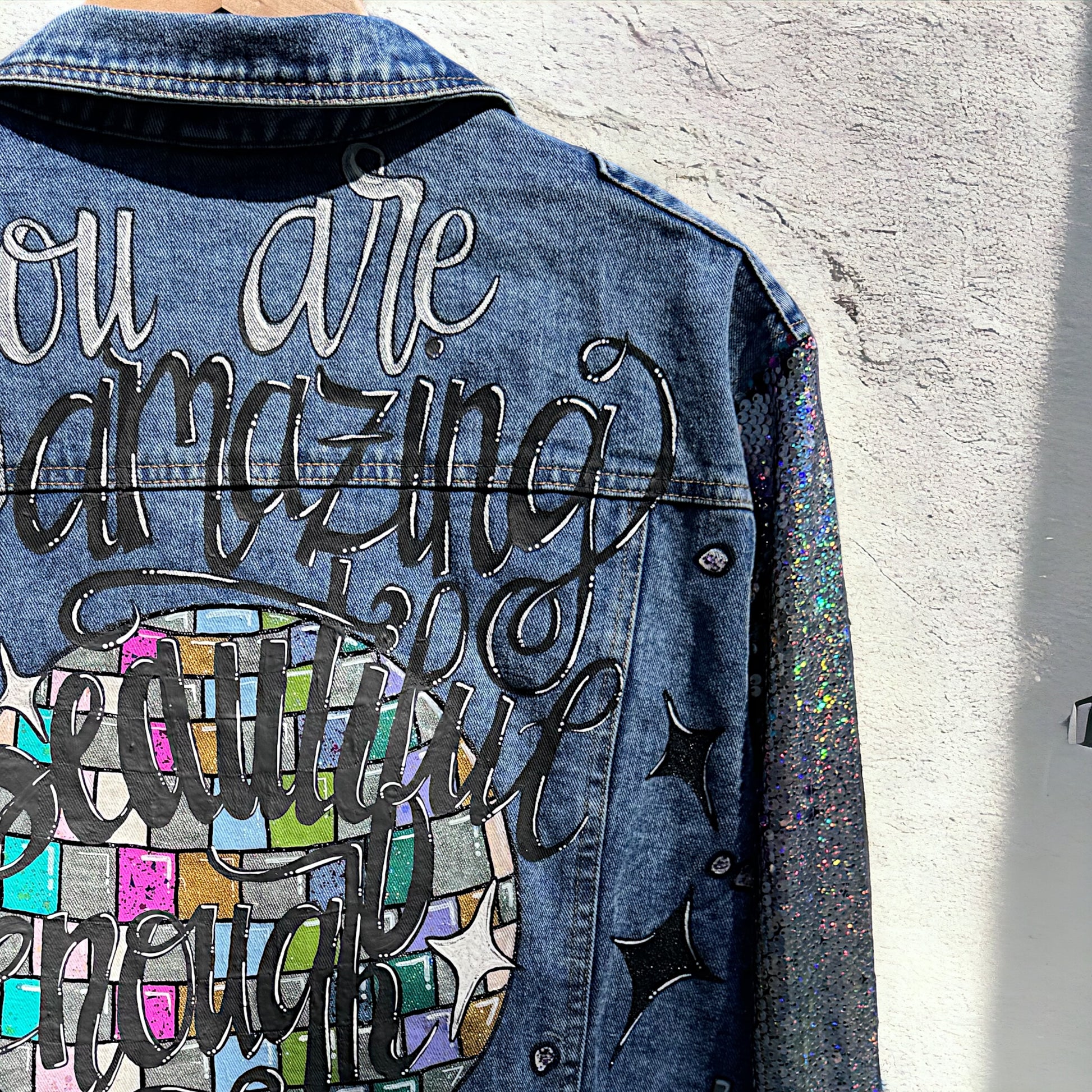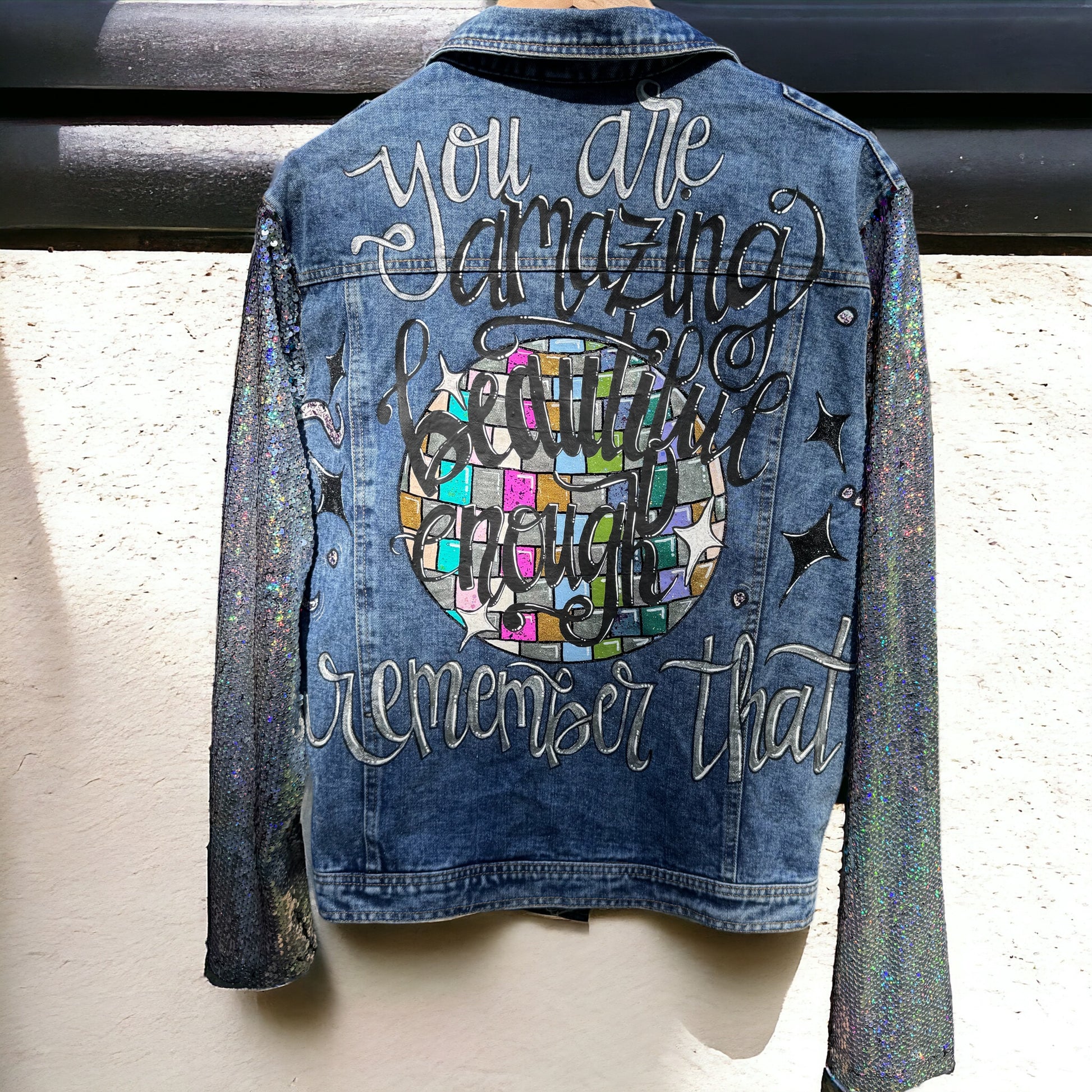 Keywords: Upcycled Jacket, Jean Jacket, Oversized Denim, Sequin Sleeves, Hand Painted, Unique Fashion, Eras Tour Outfit, Statement Piece