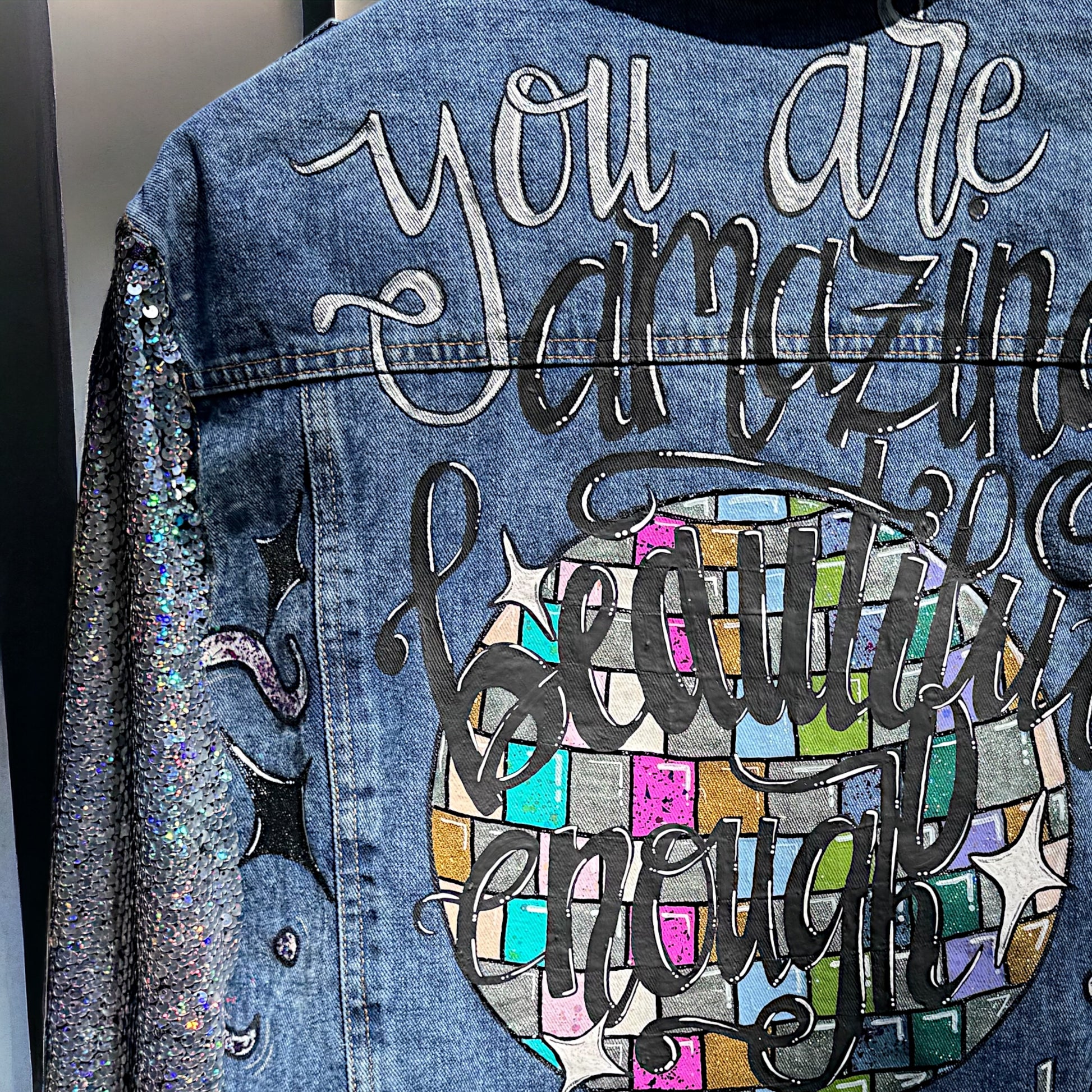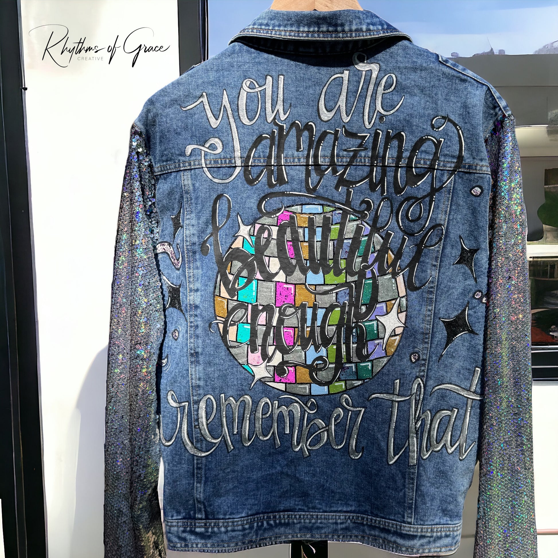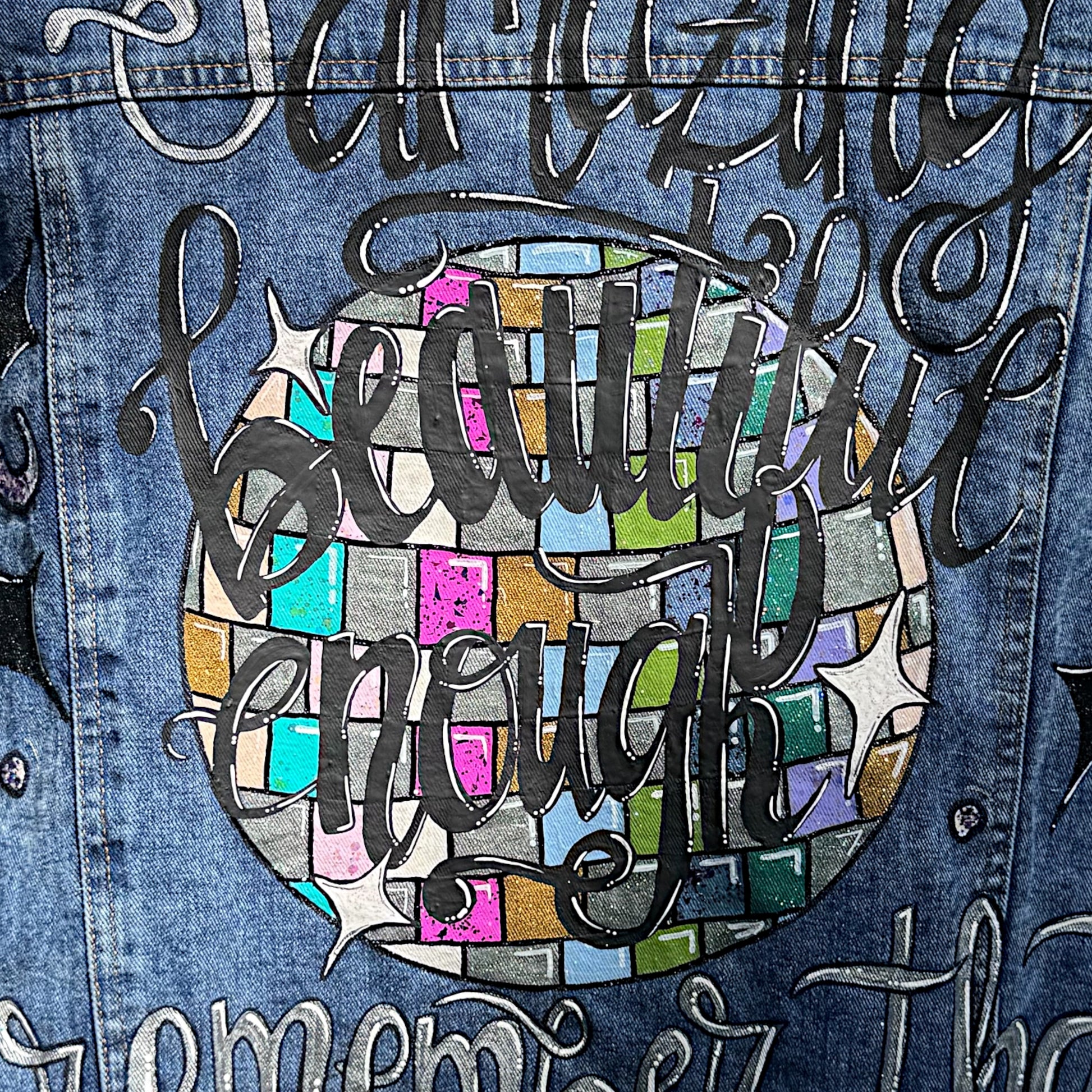 - Hand Painted Design: With the uplifting message, "You are amazing, beautiful, enough. Remember that," next to a playful disco ball.