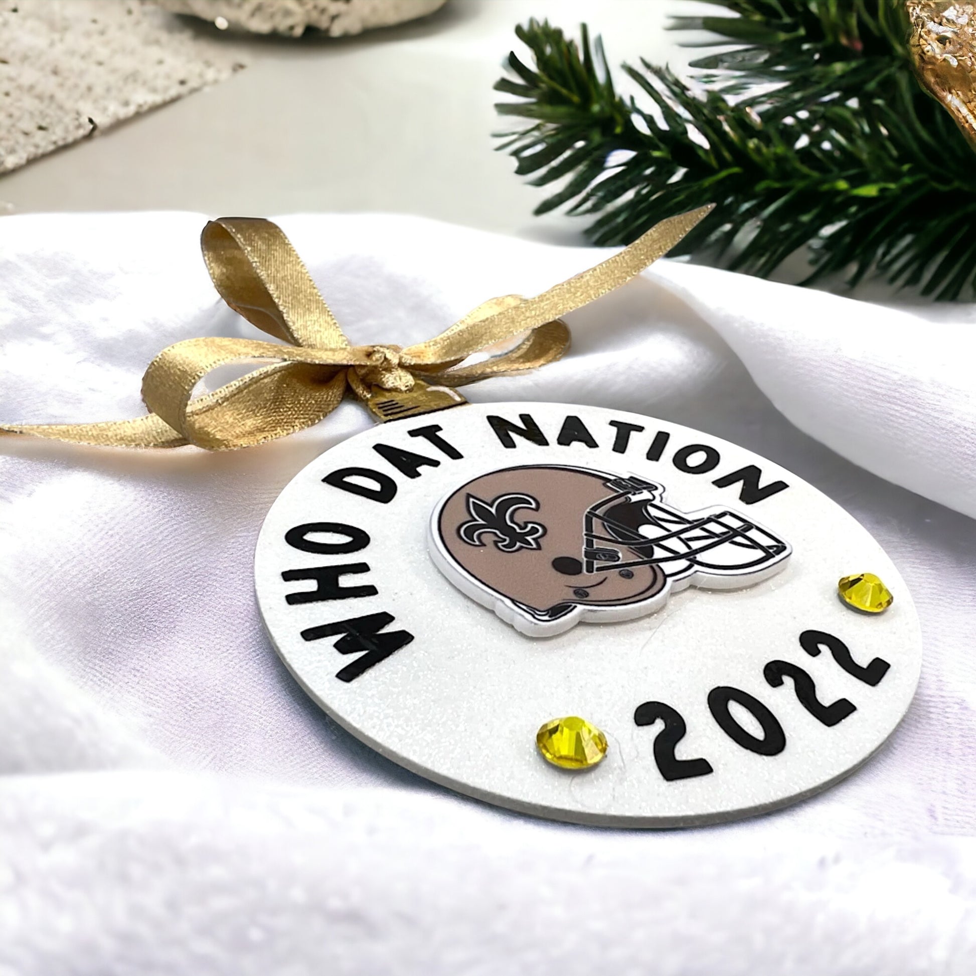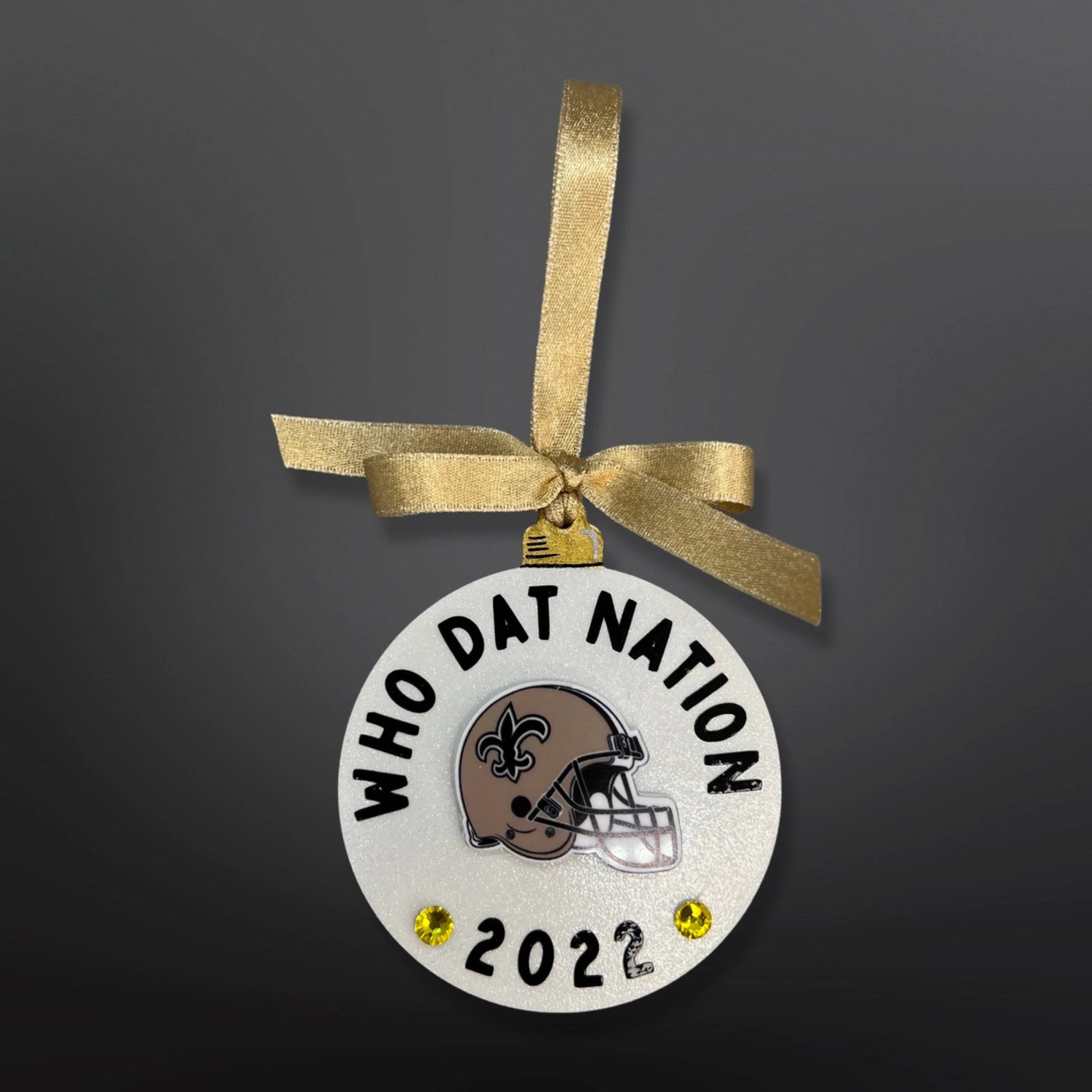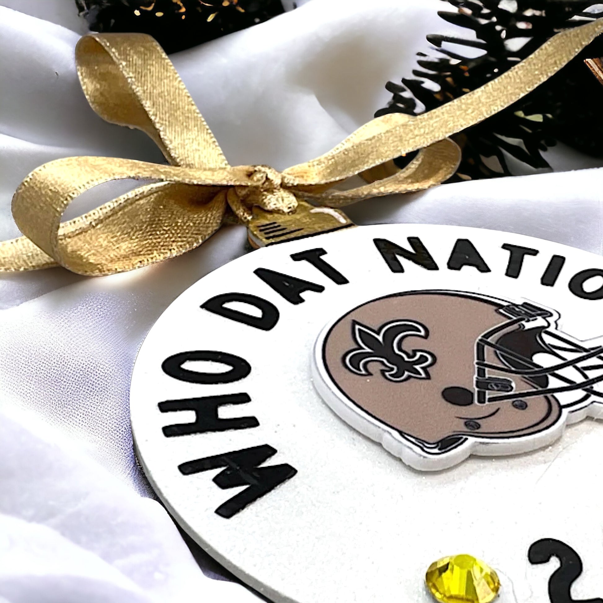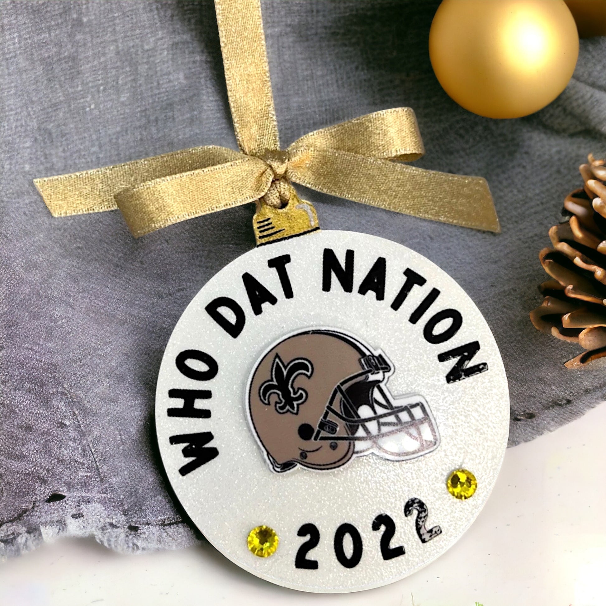 Celebrate your love for the New Orleans Saints with this handcrafted "Who Dat Nation" ornament! Perfect for fans of black and gold, this ornament adds a spirited touch to your Christmas tree or makes a thoughtful gift for fellow Saints enthusiasts.