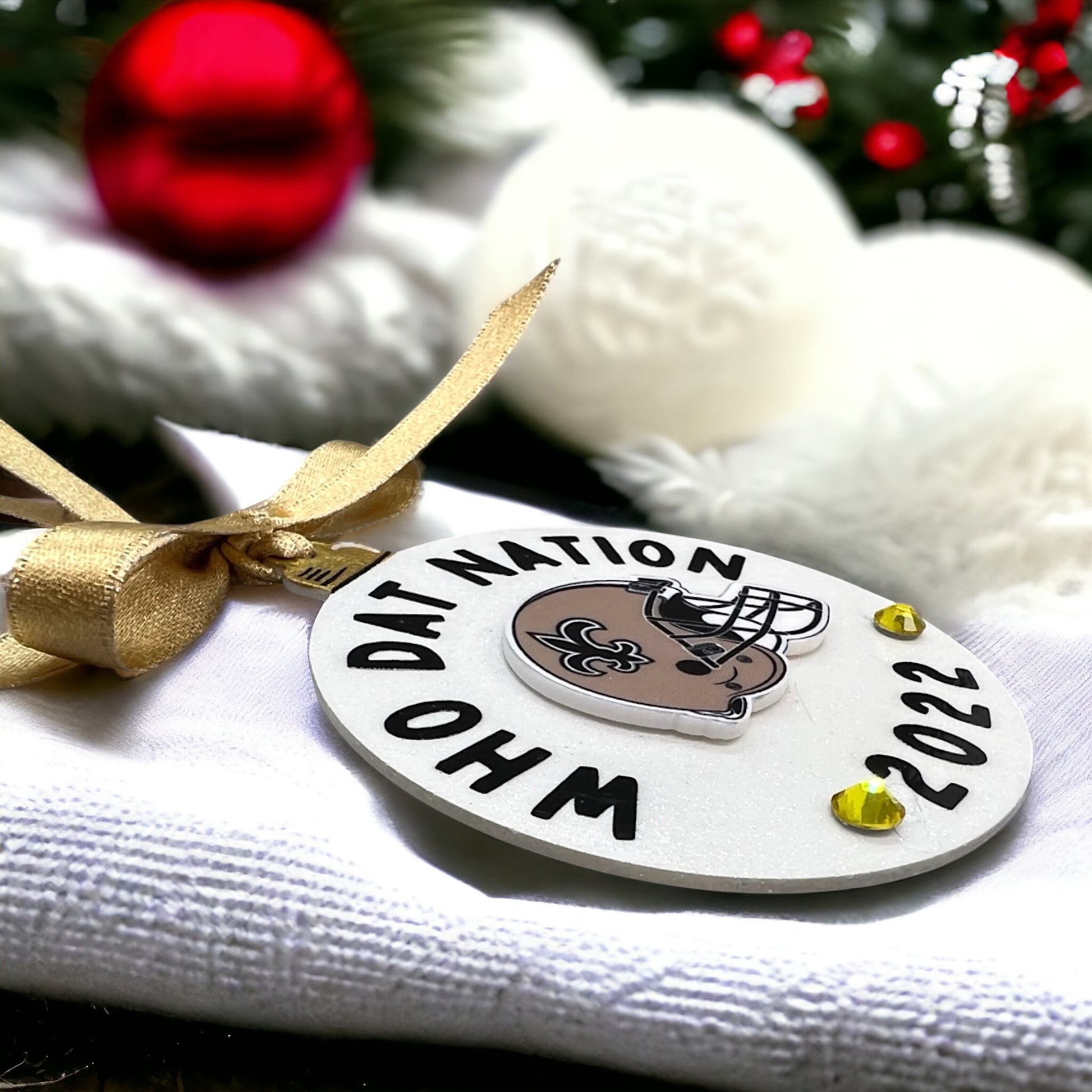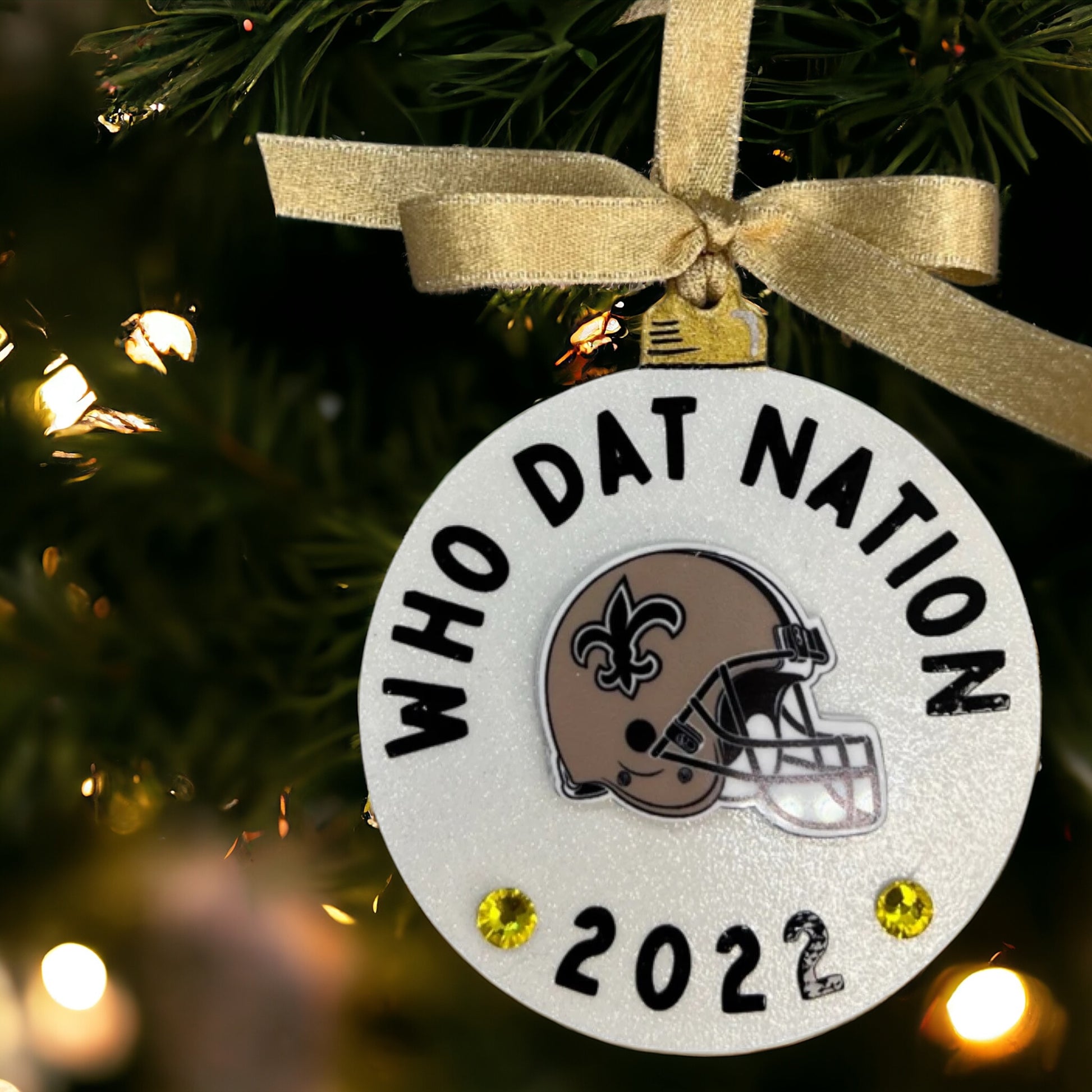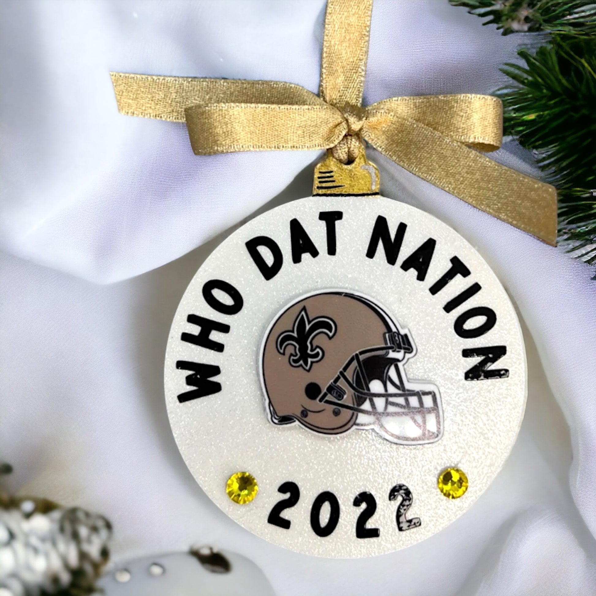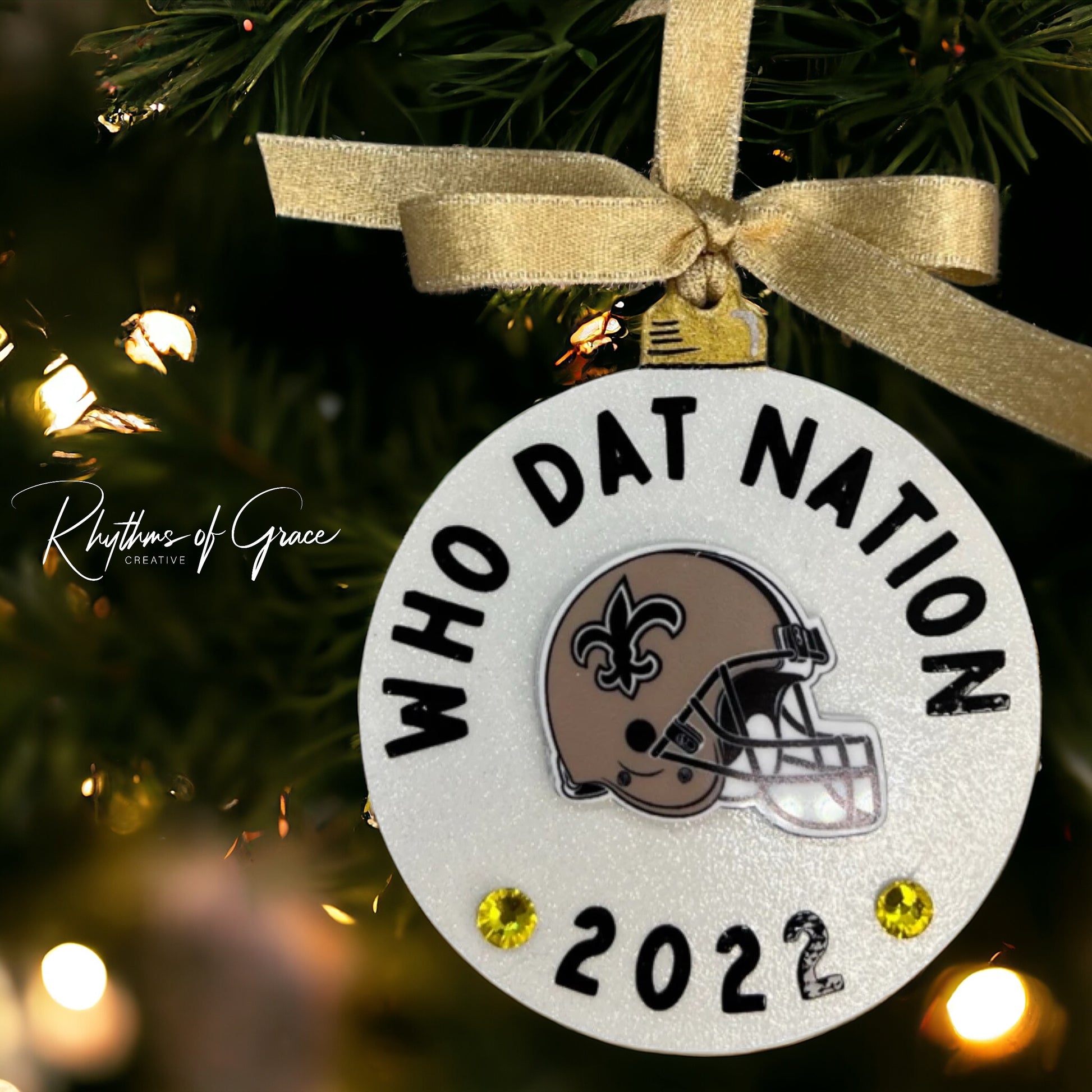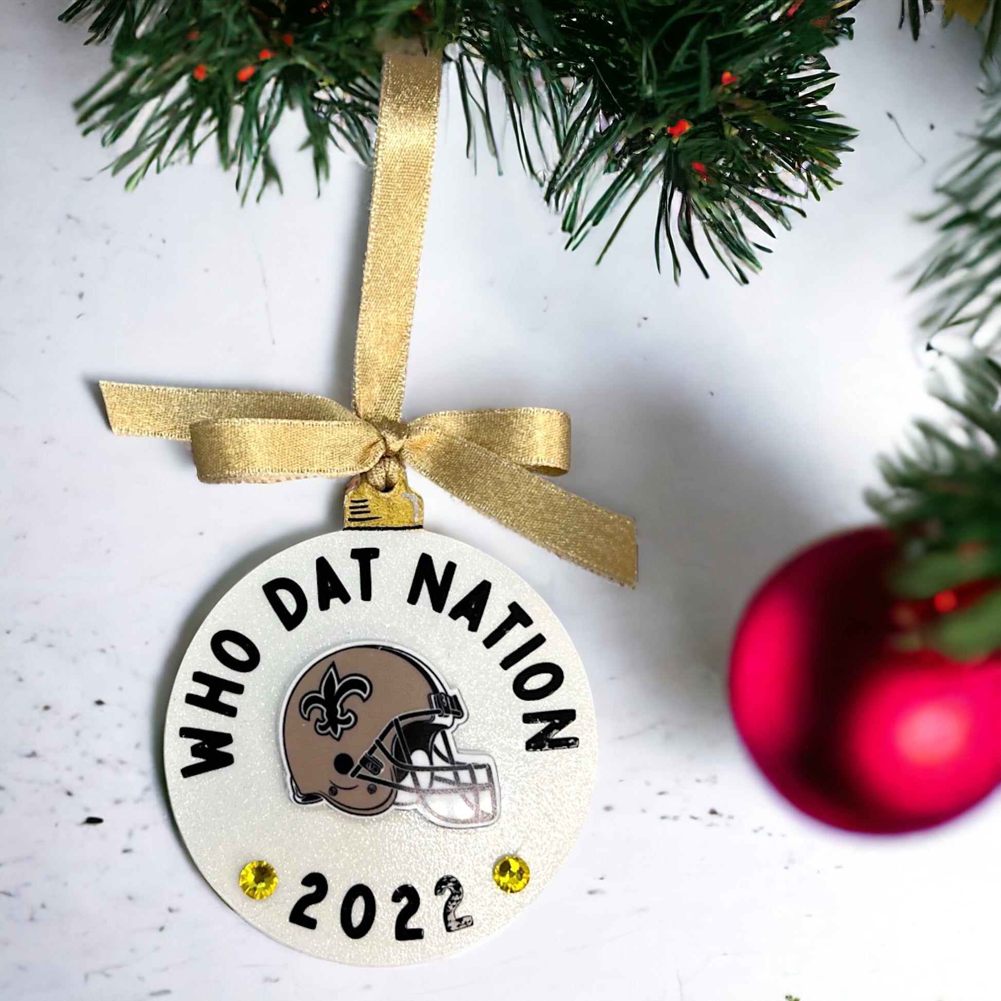 Celebrate your love for the New Orleans Saints with this handcrafted "Who Dat Nation" ornament! Perfect for fans of black and gold, this ornament adds a spirited touch to your Christmas tree or makes a thoughtful gift for fellow Saints enthusiasts.